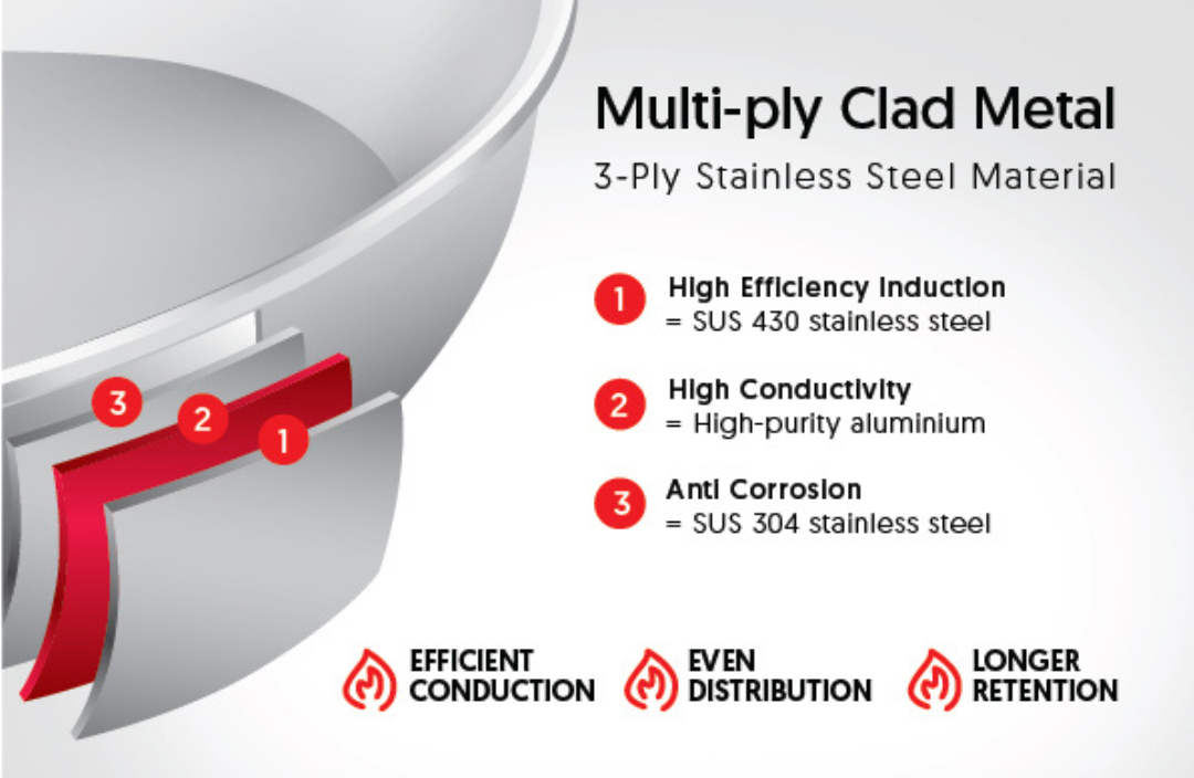 4. Do not fill multi-ply cookware with cooking oil over one-third of its capacity for deep-frying. This is to prevent oil spillage from the cookware after food is placed in.